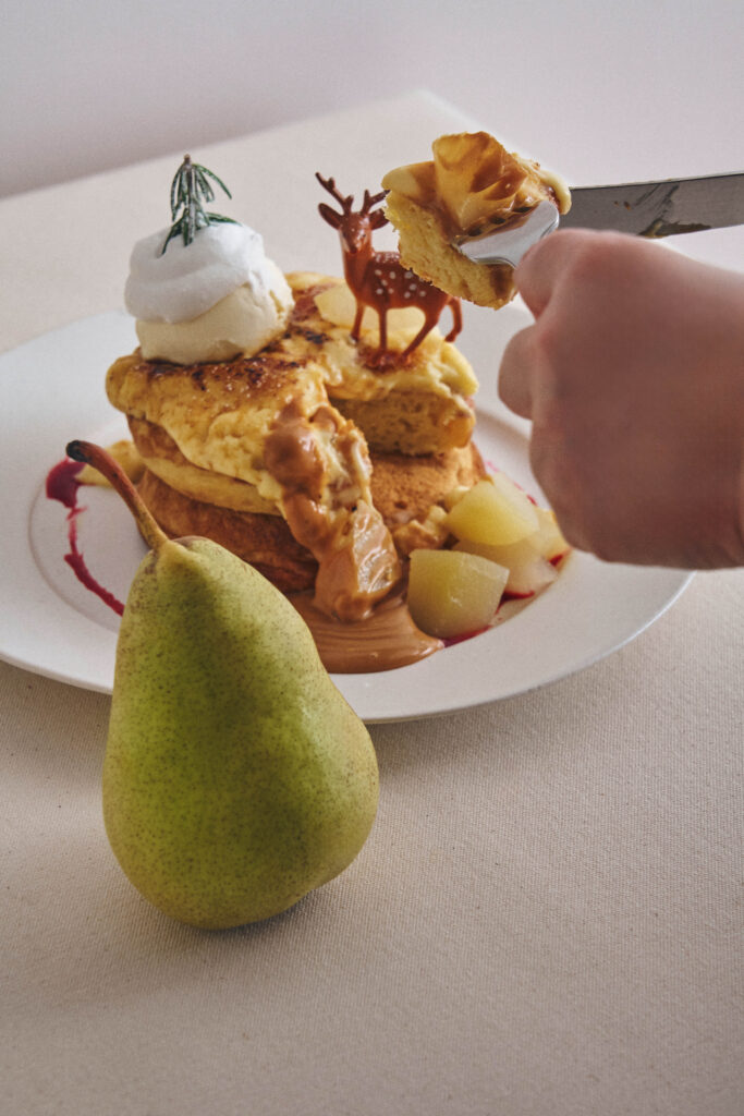 香り高いフレッシュ洋なしに、甘くとろける焦がしブリュレ。ちょっぴりほろ苦い生キャラメルソースが全体をまとめ、深みのある贅沢な味わいに。冬の午後にぴったりな、心までとろける大人のパンケーキです。