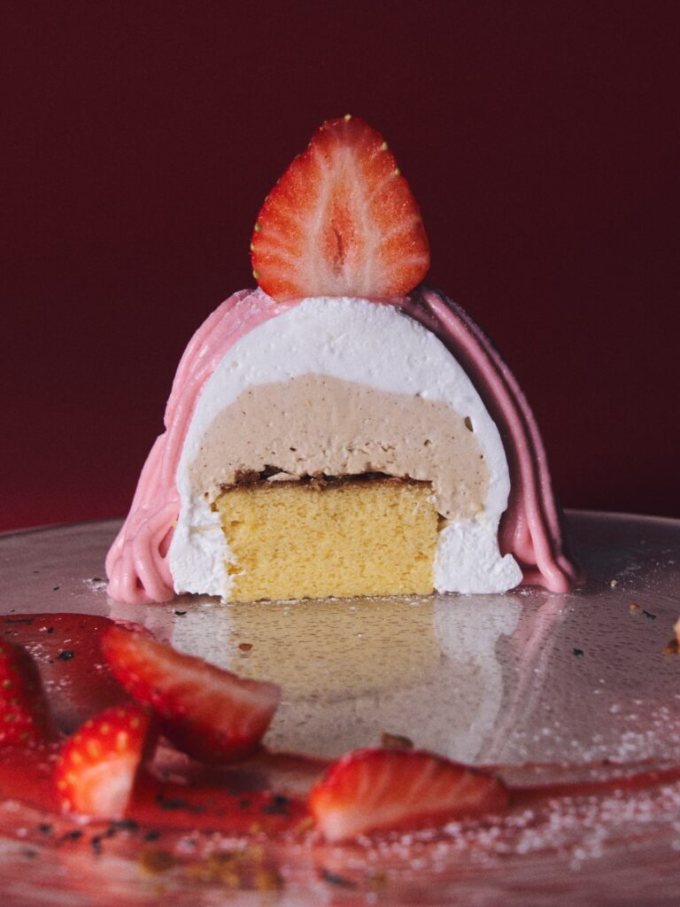 ふわりとほどける生食感シフォンに、香ばしい全粒粉サブレと濃厚なミルクティームースを重ね、仕上げにいちごの甘酸っぱいムースをたっぷりと。紅茶の深い香りが味の奥行きを生み出し、いちごの瑞々しい余韻をいっそう引き立てます。お皿には、ドレッシーにあしらったいちごソースとフレッシュいちごを添えて。シナモンを忍ばせたいちごソースが、ミルクティーとの調和を生み、上品な後味を彩ります。