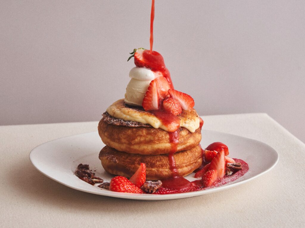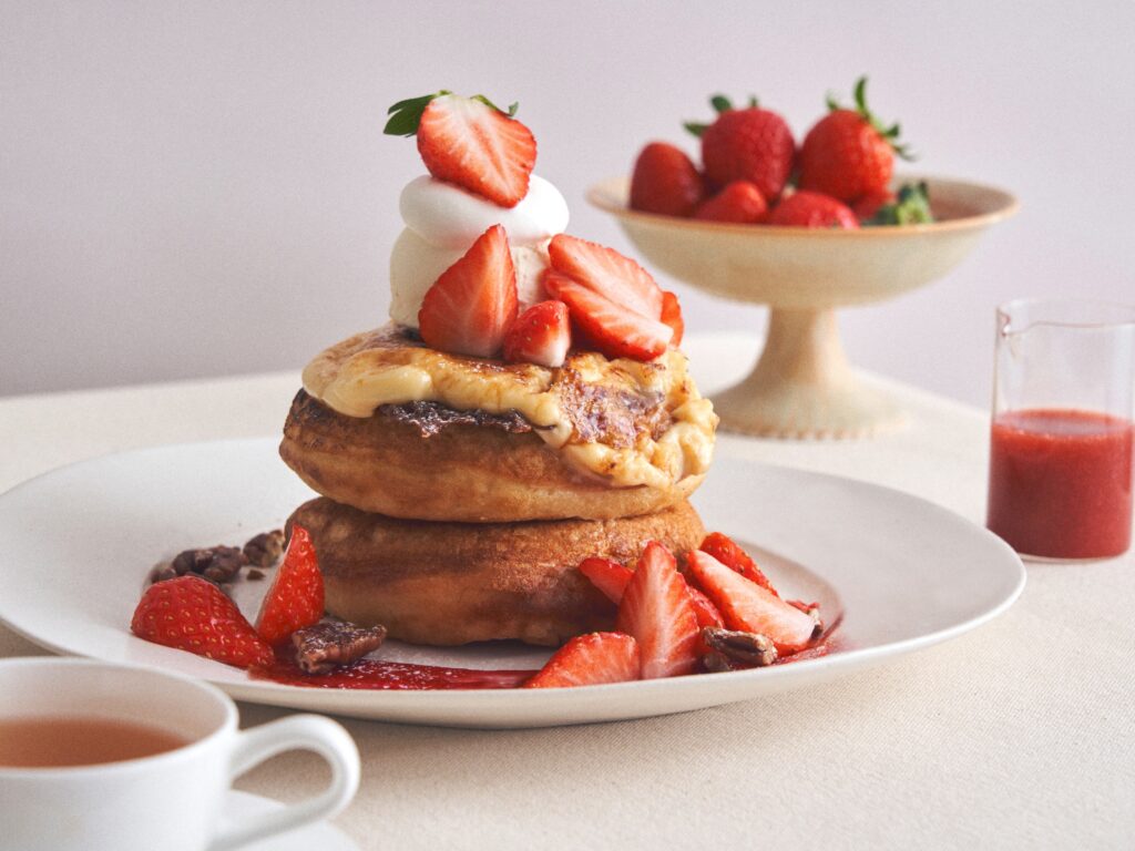 ふわもちパンケーキのあいだに、こっくりとした生バターカスタードと甘酸っぱいいちごのコンフィチュールをたっぷりサンド。ミルキーで軽やかなクリームを贅沢にのせ、甘酸っぱさとバターのコクが織りなすリッチな味わいを楽しめます。口に入れた瞬間、まるでフレジェのような濃厚さといちごの香りがふわりと広がる、特別なひと皿です。