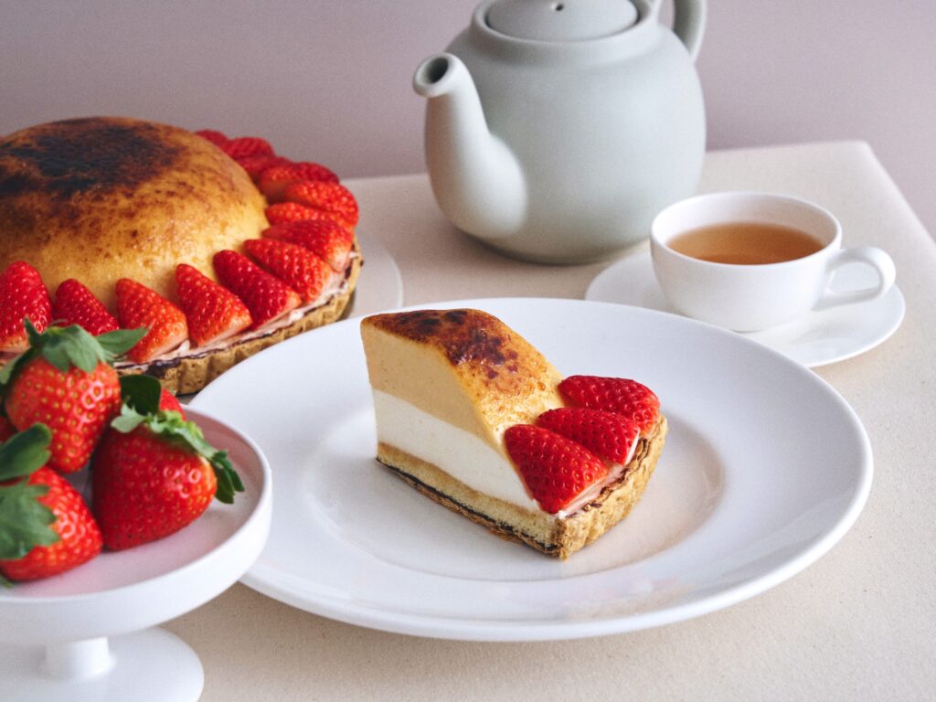 表面を香ばしく焦がしたブリュレクリームが、ふわりと溶けるパンケーキにとろりと広がり、甘酸っぱくみずみずしい “あすかルビー” のいちごをいっそう引き立てます。ひと口ごとに、パリッと軽やかなアーモンドチュイルの食感が心地よいアクセントに。濃厚なのに軽やか、まるでいちご畑のような甘い香りが広がる、とっておきのひと皿です。